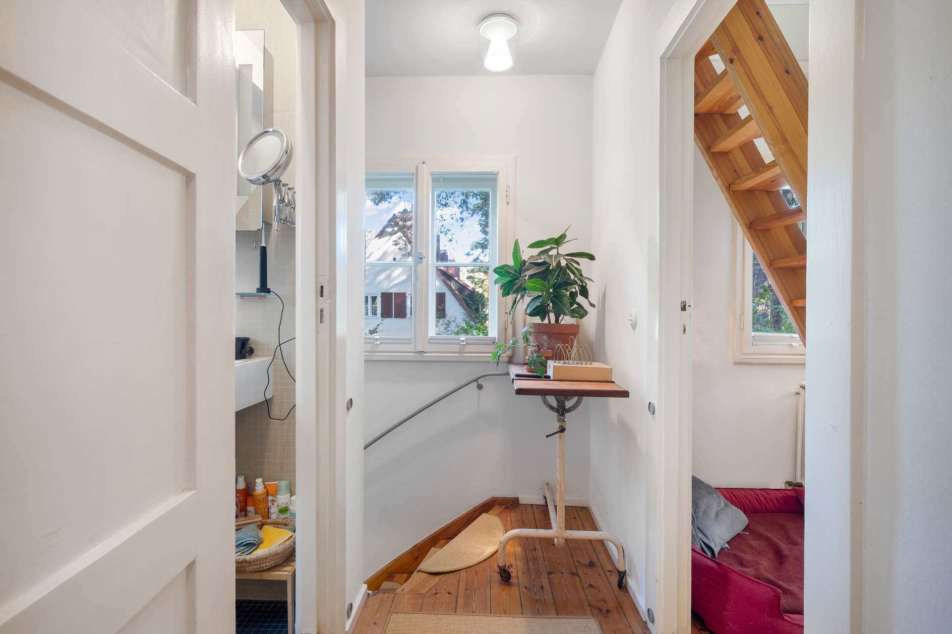 Im ersten Obergeschoss befinden sich drei Zimmer und ein helles Badezimmer mit Badewanne. Ein Schlafzimmer, ein Arbeitszimmer oder Kinderzimmer sowie ein begehbarer Kleiderschrank im Flur sowie ein zusätzliches Zimmer in welchem eine Treppe ins Dachgeschoss führt.