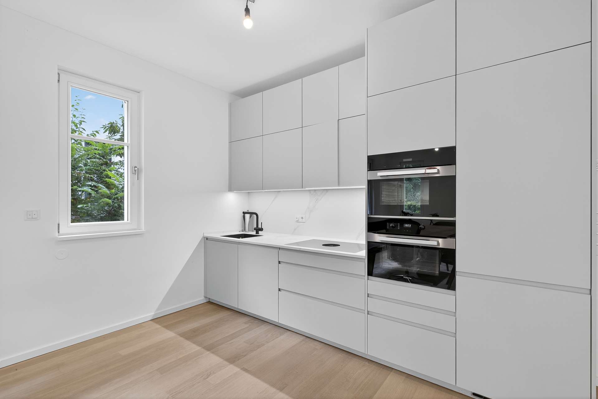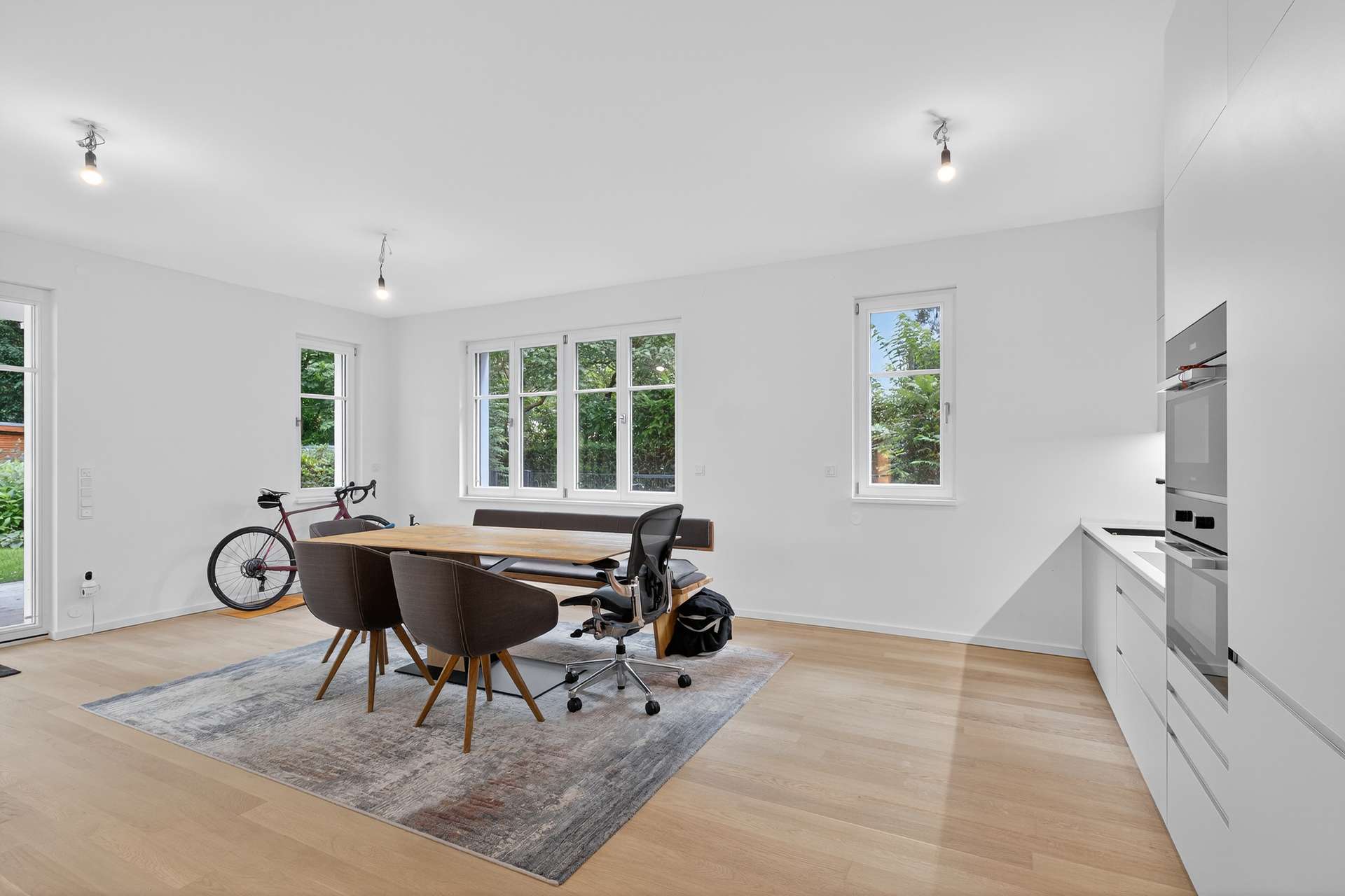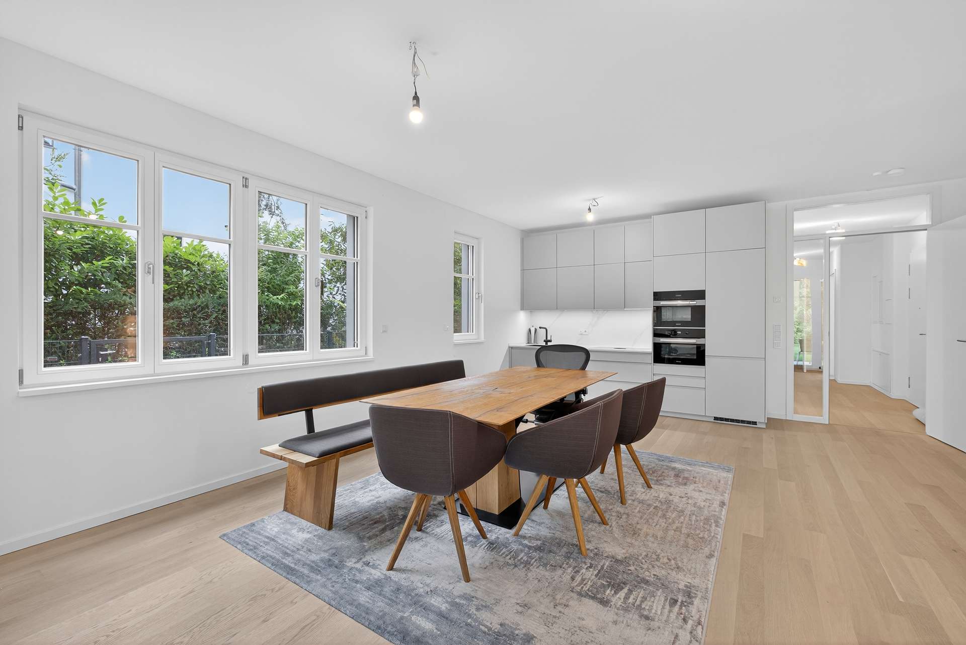 Herzstück der Wohnung ist der weitläufige Wohn- und Essbereich mit offener, hochwertiger Designküche, die keine Wünsche offen lässt. Das luxuriöse Badezimmer verfügt über edle Materialien, eine elegante Badewanne mit Gartenblick, eine moderne Dusche und einen stilvollen Waschplatz. Für Besucher gibt es ein zusätzliches Gäste-WC.