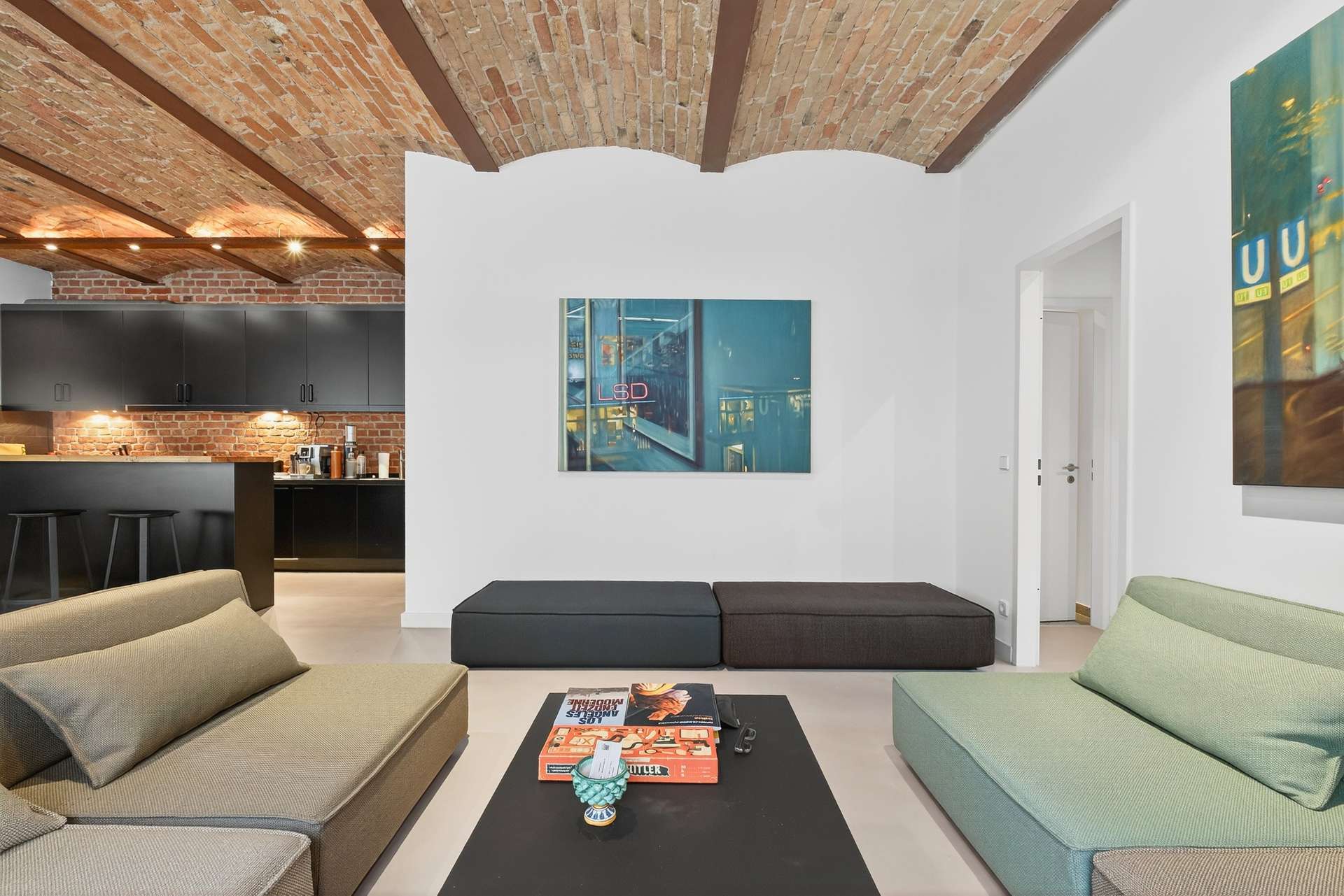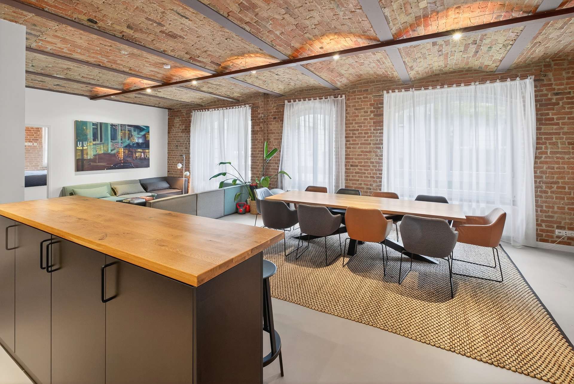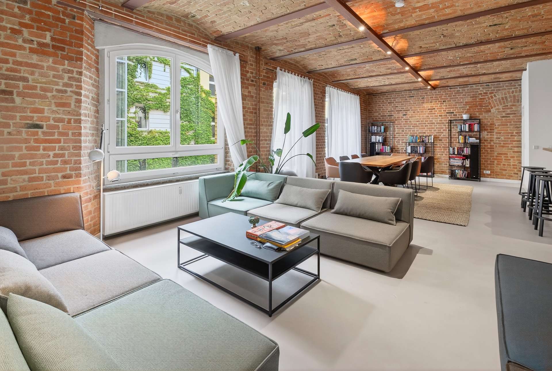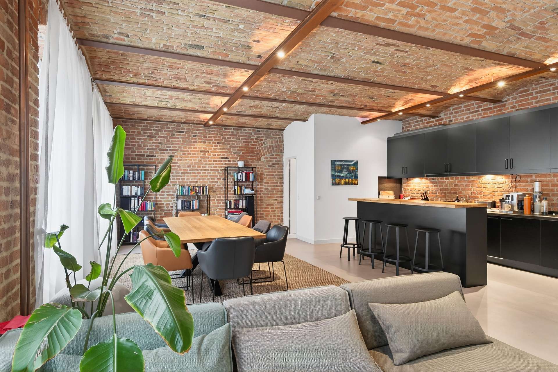 Die Wohnung bietet auf ca. 104 Quadratmeter mit ihren preußischen Kappendecken ein einzigartiges und offenes Wohnerlebnis. Mit einem Schlafzimmer, einem vollausgestattetem Badezimmer mit Dusche und Badewanne, einem Gäste-WC sowie einem clever nutzbaren Eingangsbereich mit Sitzmöglichkeit. Das lichtdurchflutete Loft erscheint dank der großen Fensterfronten stets hell und freundlich. Ein weiteres Highlight ist die exklusive Küche mit Elektrogeräten, die sich durch ihr minimalistisches und modernes Design perfekt in den offenen Wohn- und Essbereich mit Küchentresen schmiegt. Ein Weinkühlschrank rundet das Angebot ab.