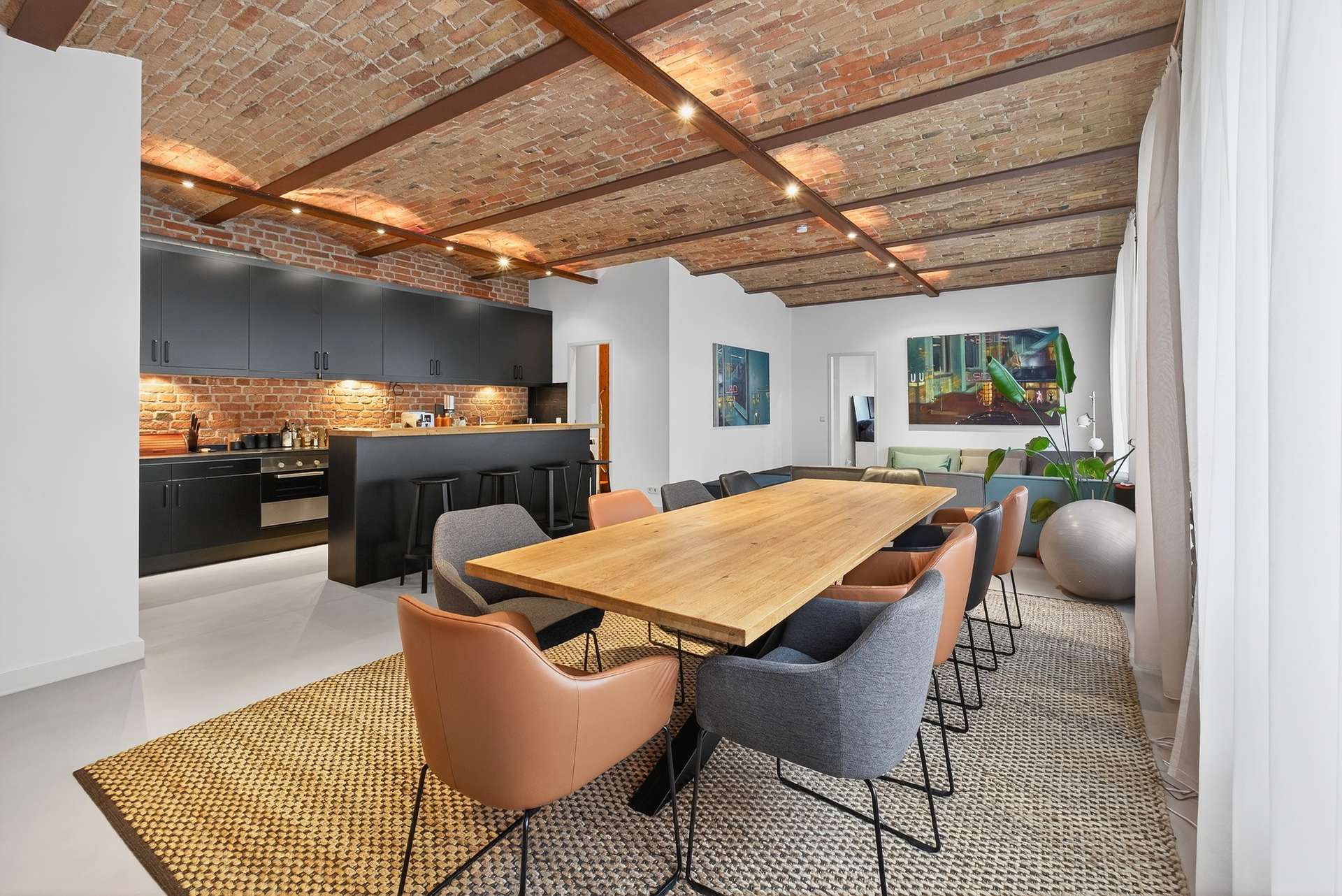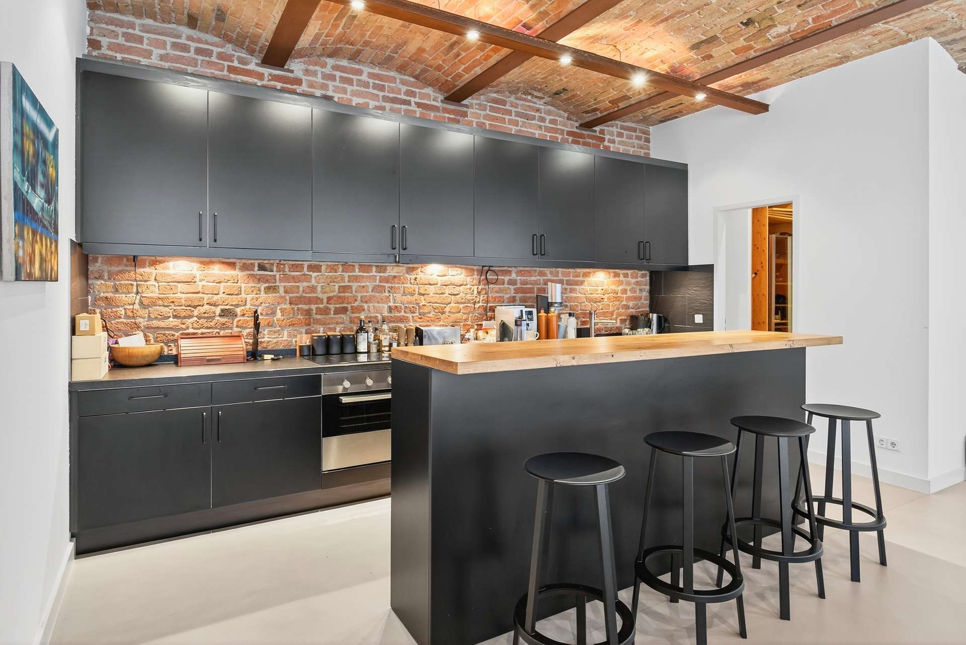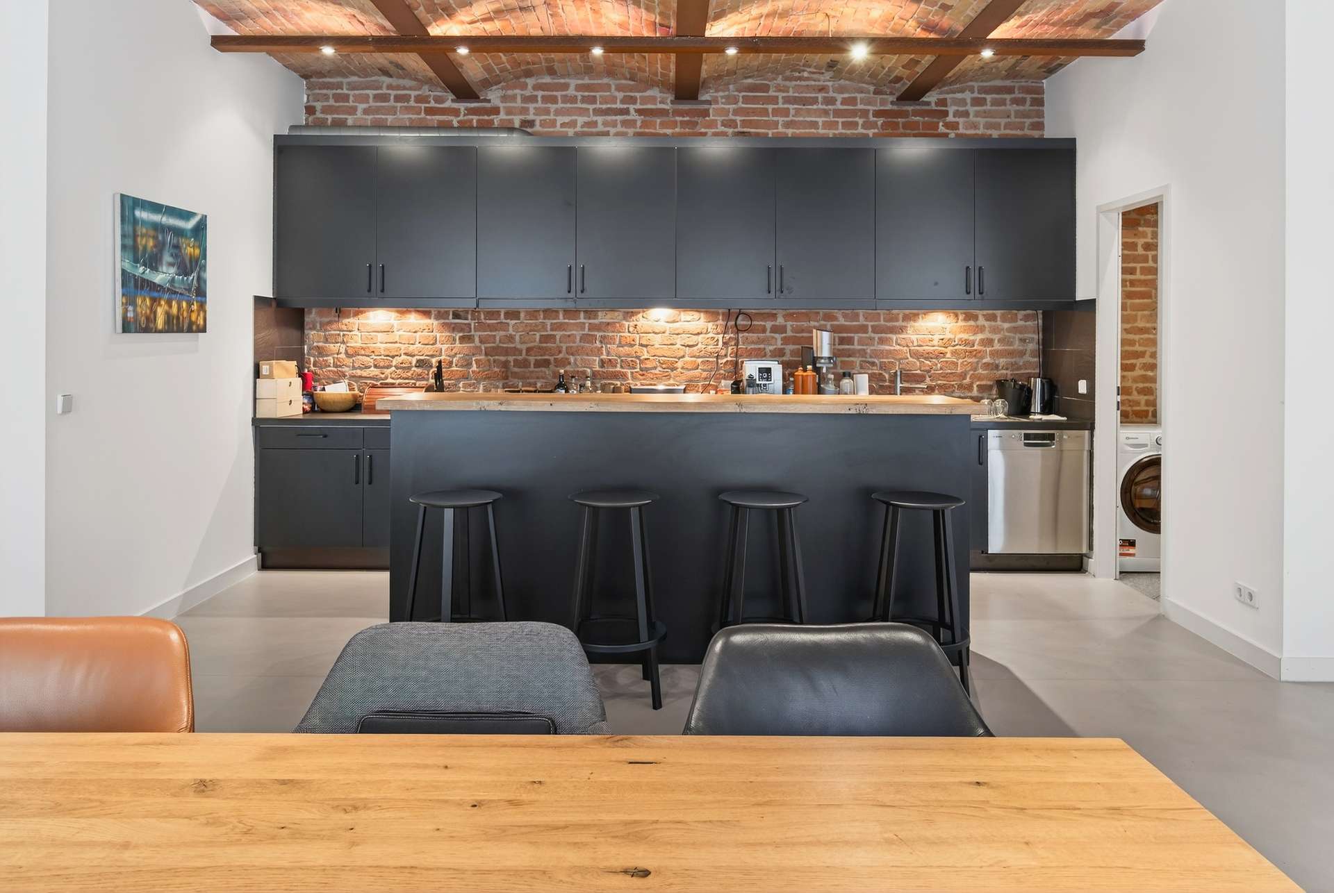 Die Wohnung bietet auf ca. 104 Quadratmeter mit ihren preußischen Kappendecken ein einzigartiges und offenes Wohnerlebnis. Mit einem Schlafzimmer, einem vollausgestattetem Badezimmer mit Dusche und Badewanne, einem Gäste-WC sowie einem clever nutzbaren Eingangsbereich mit Sitzmöglichkeit. Das lichtdurchflutete Loft erscheint dank der großen Fensterfronten stets hell und freundlich. Ein weiteres Highlight ist die exklusive Küche mit Elektrogeräten, die sich durch ihr minimalistisches und modernes Design perfekt in den offenen Wohn- und Essbereich mit Küchentresen schmiegt. Ein Weinkühlschrank rundet das Angebot ab.