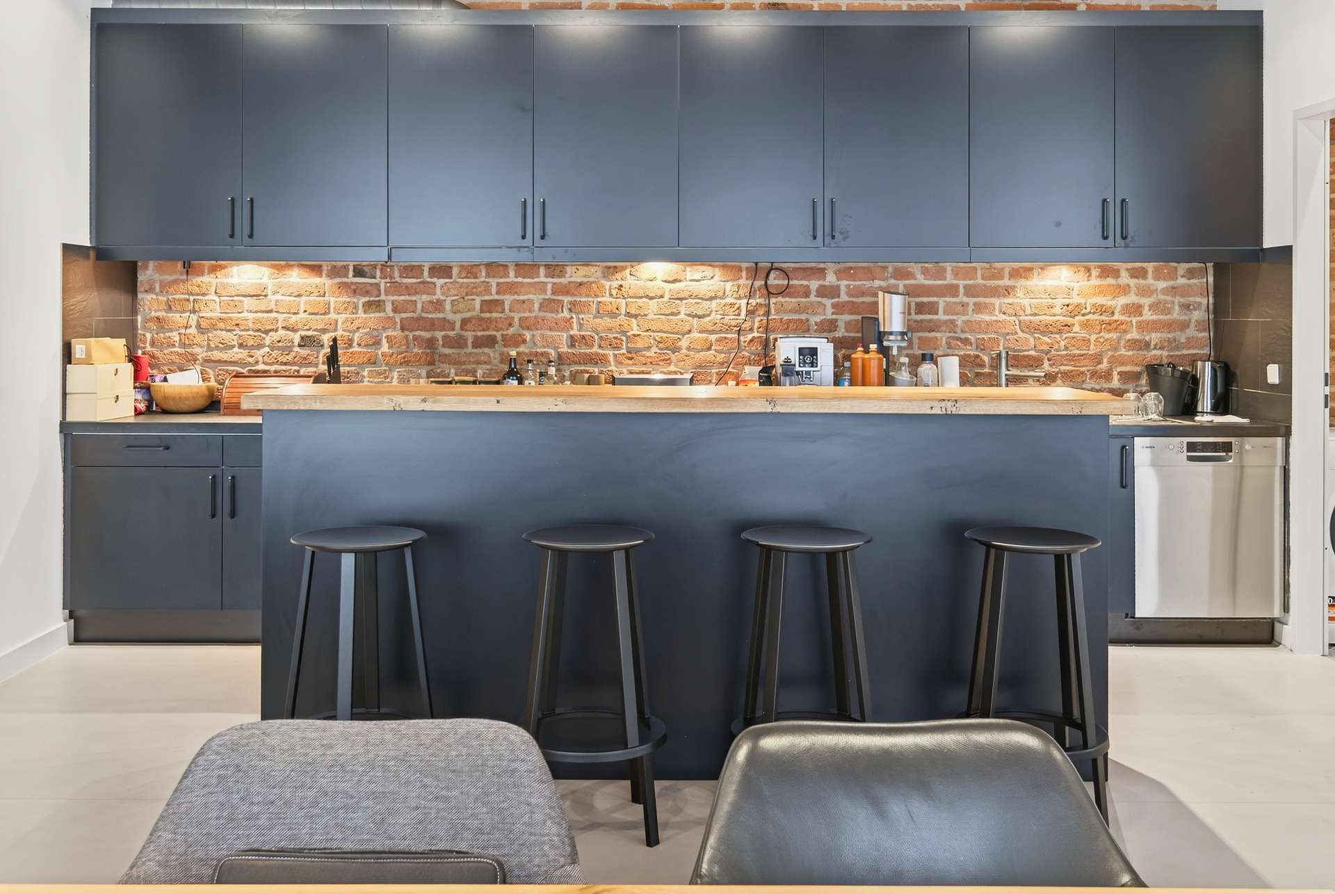 • Voll ausgestattete offene Küche mit Tresen und Einbaugeräten